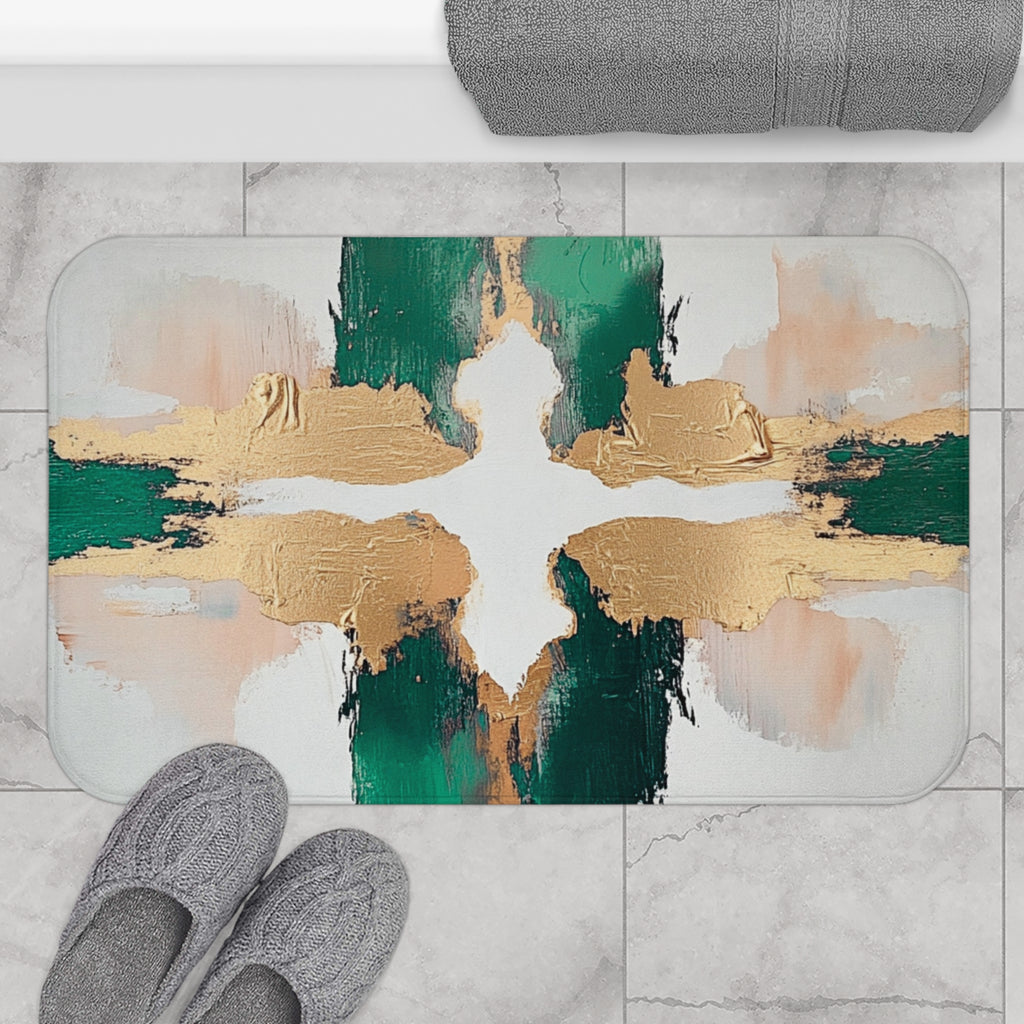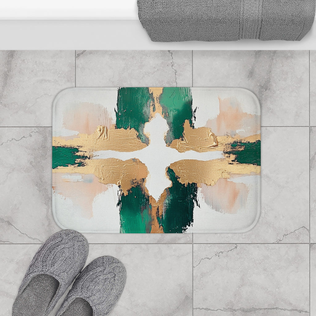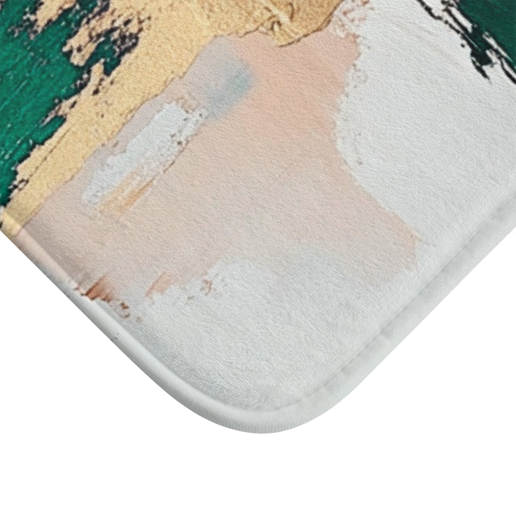 Abstract Bath Mat | Green White, Muted Gold Beige Kitchen Mat