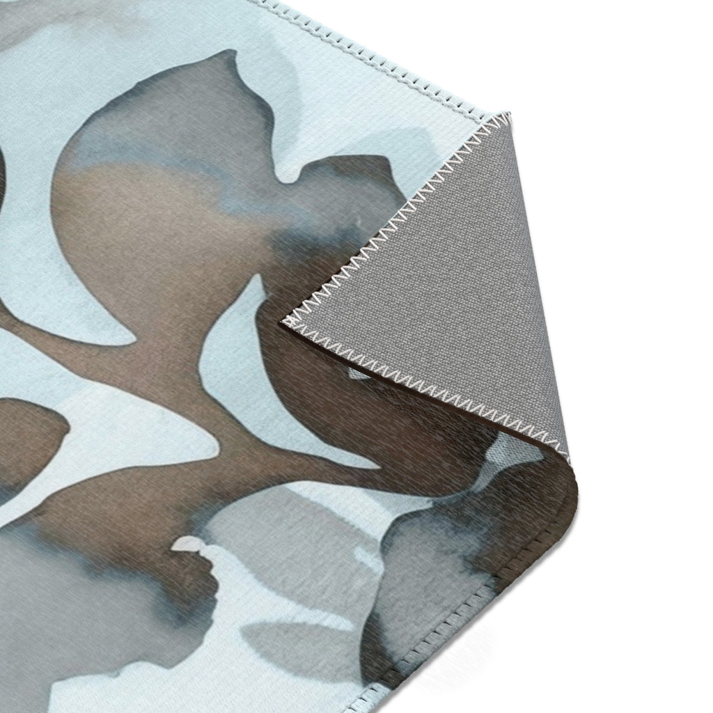 An abstract floral area rug in blue grey watercolor design, adding a touch of artistic flair to any room. Perfect for those looking to enhance their home decor with a modern and stylish touch. Ideal for individuals who appreciate unique and vibrant home accessories. Relevant for home decorations, housewarming gifts, and room makeovers.