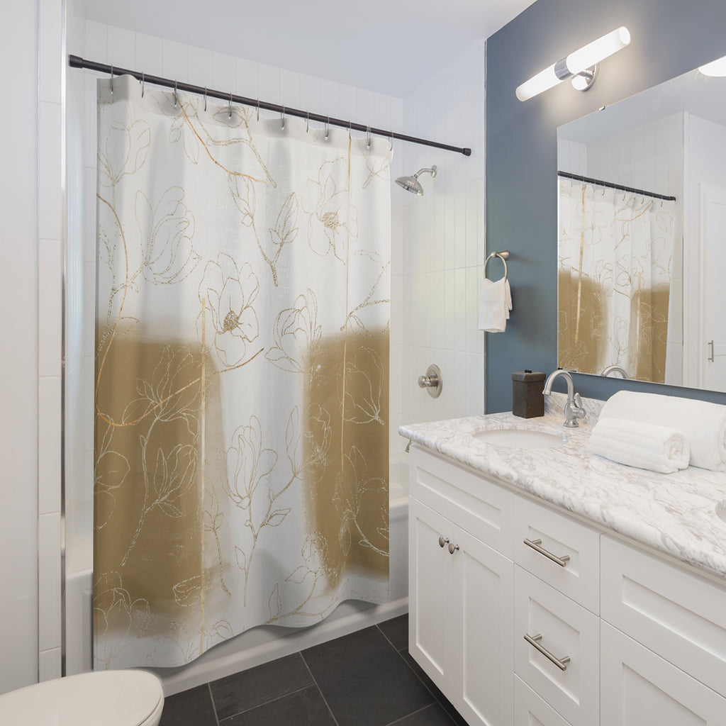 Boho Abstract Shower Curtain | Camel Beige White Floral Line Art