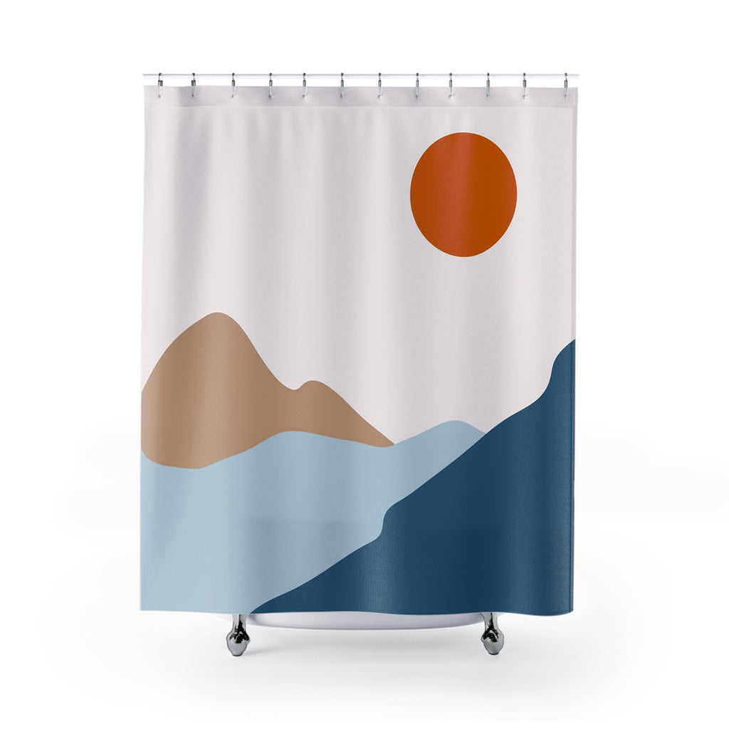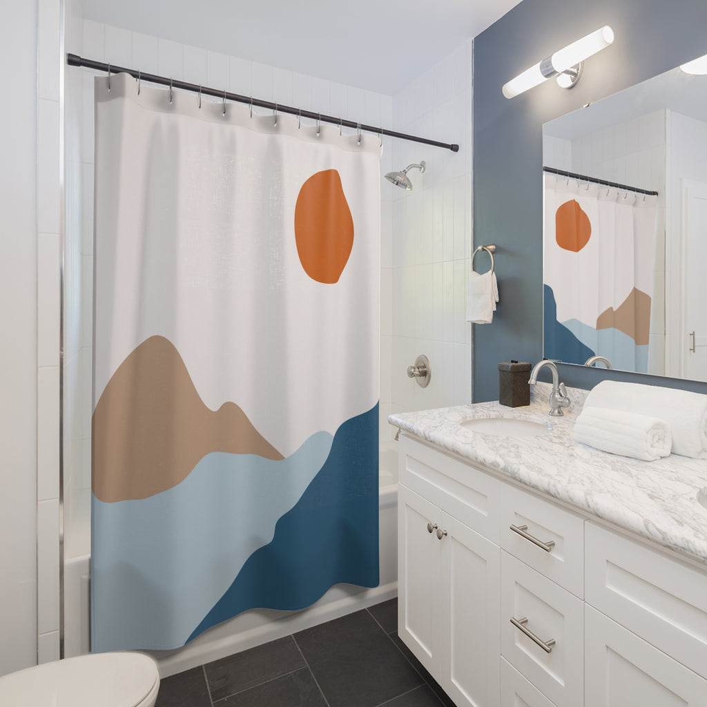 Boho Shower Curtain | Blue Beige Red Abstract Landscape