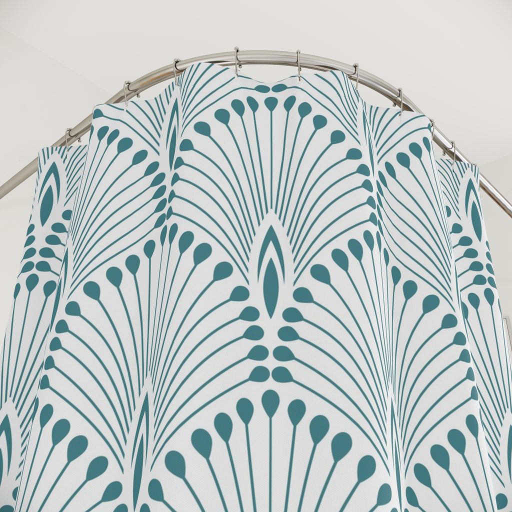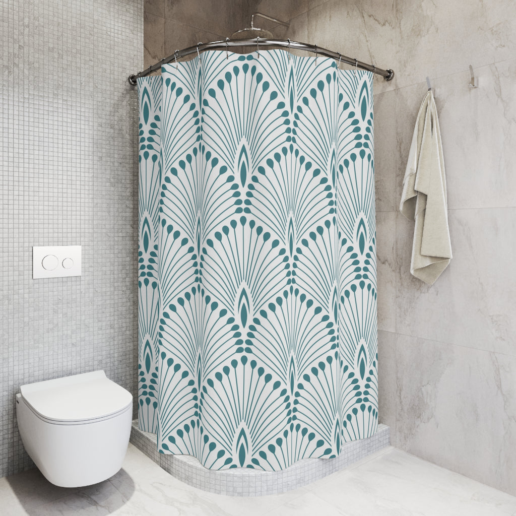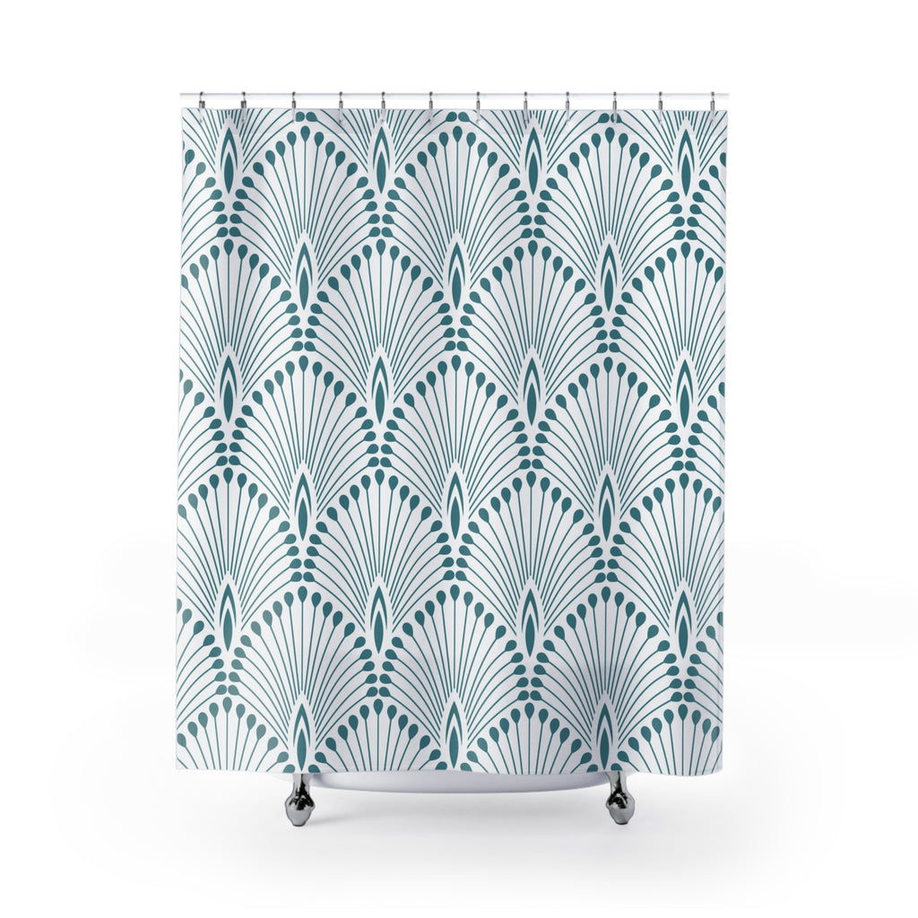 Boho Shower Curtain | Vintage Blue White Art Deco Crane