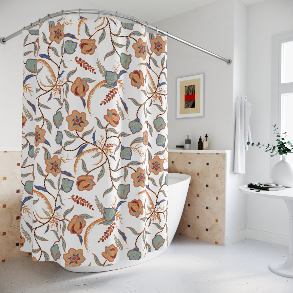 Boho Shower Curtain | White Blue Muted Orange Floral