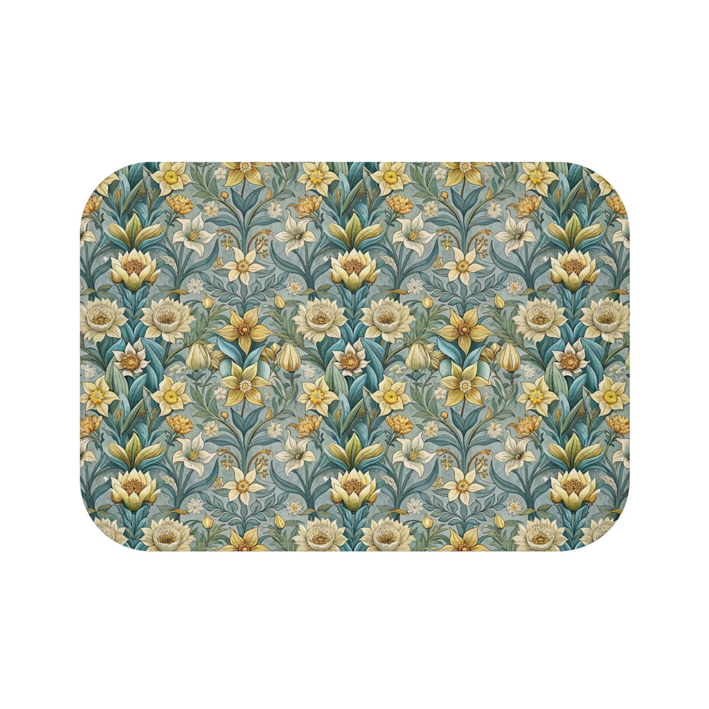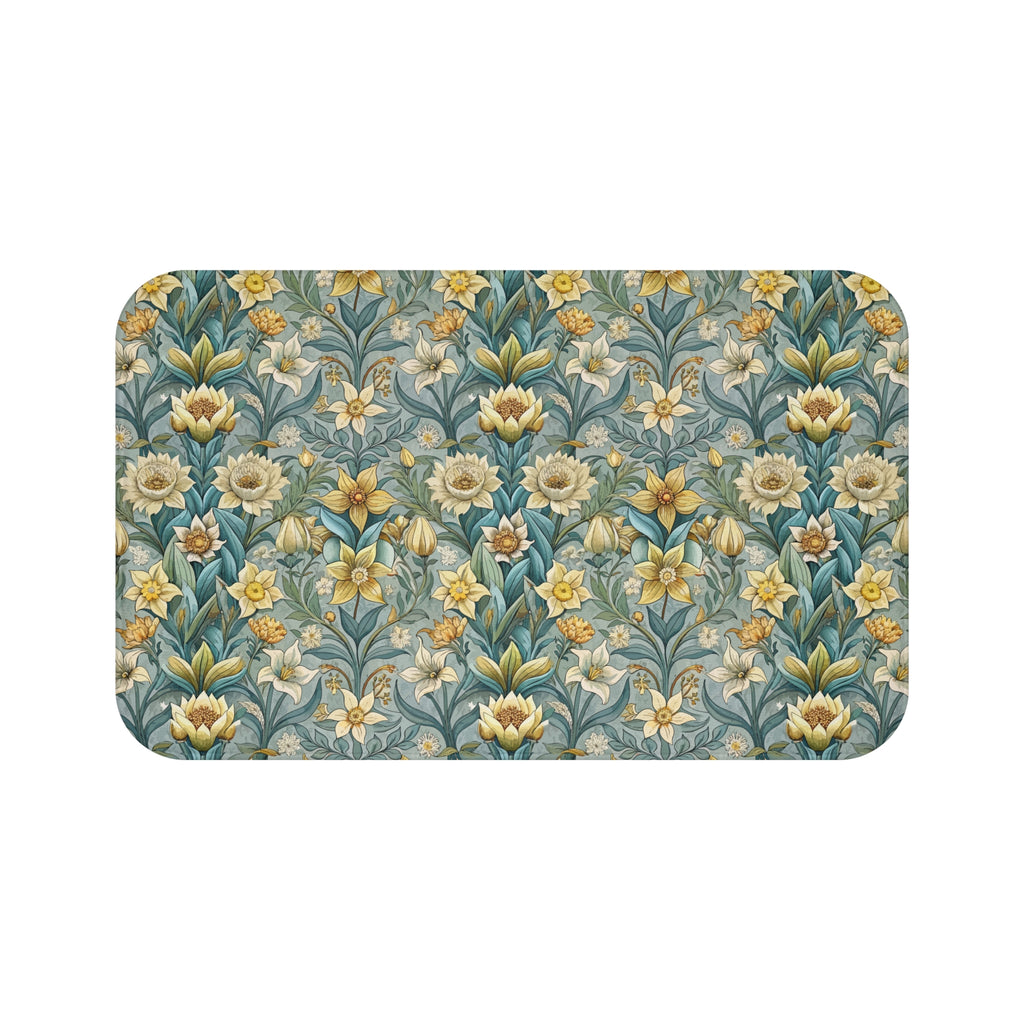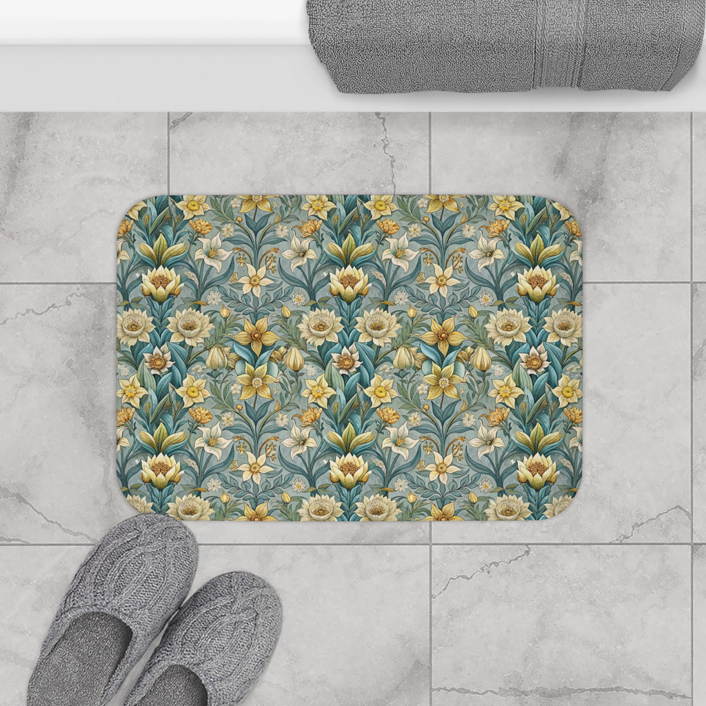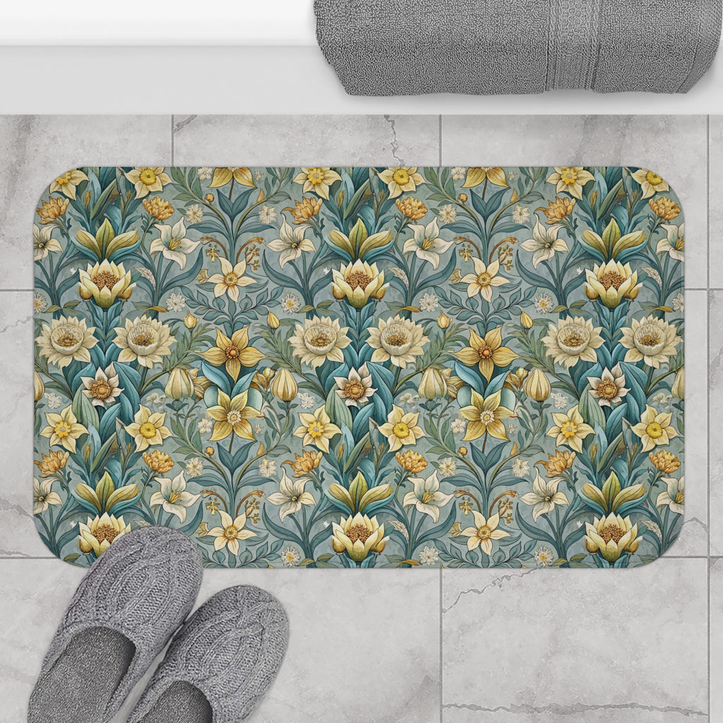 Floral Bath Mat | Vintage Blue Yellow Garden Kitchen Mat