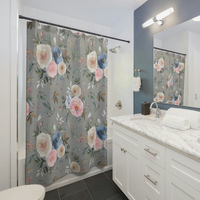 Floral Shower Curtain | Gray Pastel Pink, Blue Ivory Roses Botanical